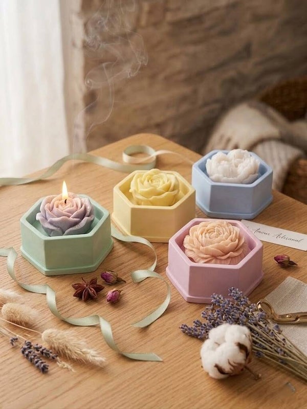contenant hexagonale, cire coulée parfumée + grosse fleur fondant parfumée (contactez-moi pour la compo couleurs)